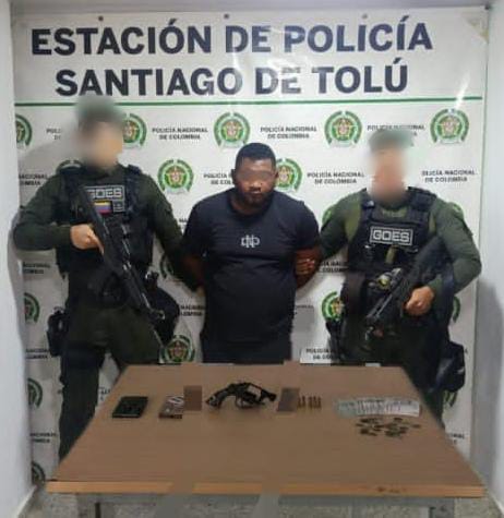 Las autoridades lograron la captura de Jorge Leonardo Lans Franco, por el delito de fabricación, tráfico y porte de armas de fuego, accesorios, partes o municiones en el barrio Playa Hermosa, en el municipio de Tolú, Sucre, cuando uniformados del Grupo de Operaciones Especiales (GOES) adelantaban labores de control y observaron la actitud sospechosa del ciudadano. Tras practicarle un registro personal voluntario, se le halló en su poder: Un arma de fuego tipo revólver, calibre 38, Seis (06) cartuchos calibre 38 y dos celulares.