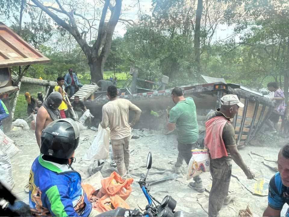 Tractomula cargada de cemento se volcó en vía de Sucre